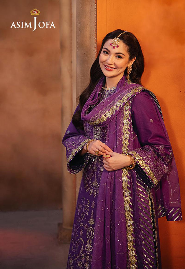 Let this purple outfit, with hints of aster’s glamour, exude an aura of timeless allure. The meticulously embroidered shirt, a masterpiece in itself, features duo-toned mink and pink zari like stardust woven into the fabric. Light gold cupped sequins, sprinkled like dews on fallen aster petals, catch the light and whisper of forgotten wishes. A meticulously embroidered dupatta, a dreamlike cascade of elegance, completes the ensemble, carrying you to the heart of any occasion.